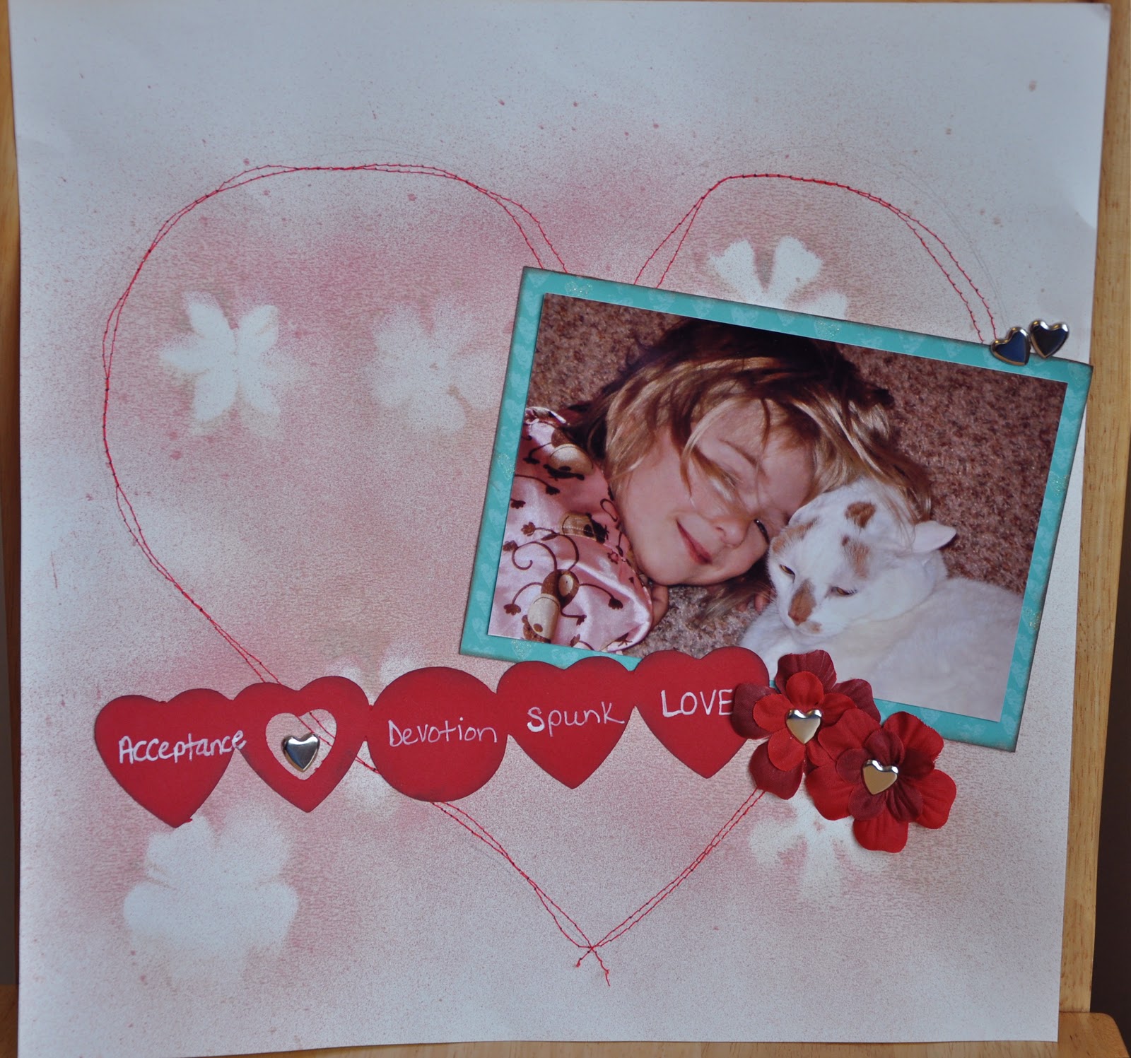 So we are getting a whopper of a storm (at least for the midwest, not when compared to my home range of New England!) So the girls were out of school, my husband came home early and I knew I'd be stuck inside. Ever since finishing that mini album I have been on a Valentine's kick! I really wanted to make a banner for my mantel and had this great vision in mind, very frilly and cute. The reality was not so frilly, very plain but I think cute just the same. I am very pleased with myself. I managed to get this done in between doing copious amounts of laundry!! All of the hearts were cut with my Cricut Expression. I used the Love Struck 2010 cartridge and the Calligraphy cartridge for the letters, plus some yummy glimmer mist. Here is the banner: